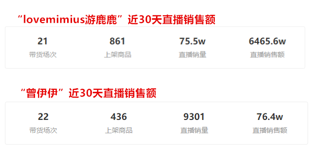 据飞瓜数据显示,近30天内(2021年6月23日至2021年7月22日),游鹿鹿在抖音的总直播销售额达6465.6万元,曾伊伊的总直播销售额为76.4万元。不难看出,主次分明的矩阵账号,与销售额成正相关的关系。
