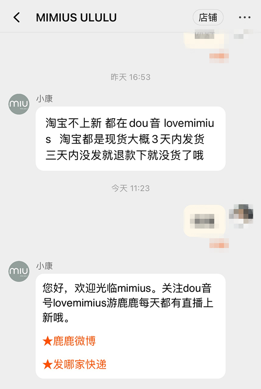 在游鹿鹿的微博评论区,大量粉丝的留言足以说明其忠实粉丝之多,诸如“询问图片服饰会否出新品”“买了许多件”等评论;由此看出,游鹿鹿在社交平台上发布的内容,带有强劲的种草属性。此外,用户在淘宝追问店铺上新问题,客服会直接将其引导至抖音。