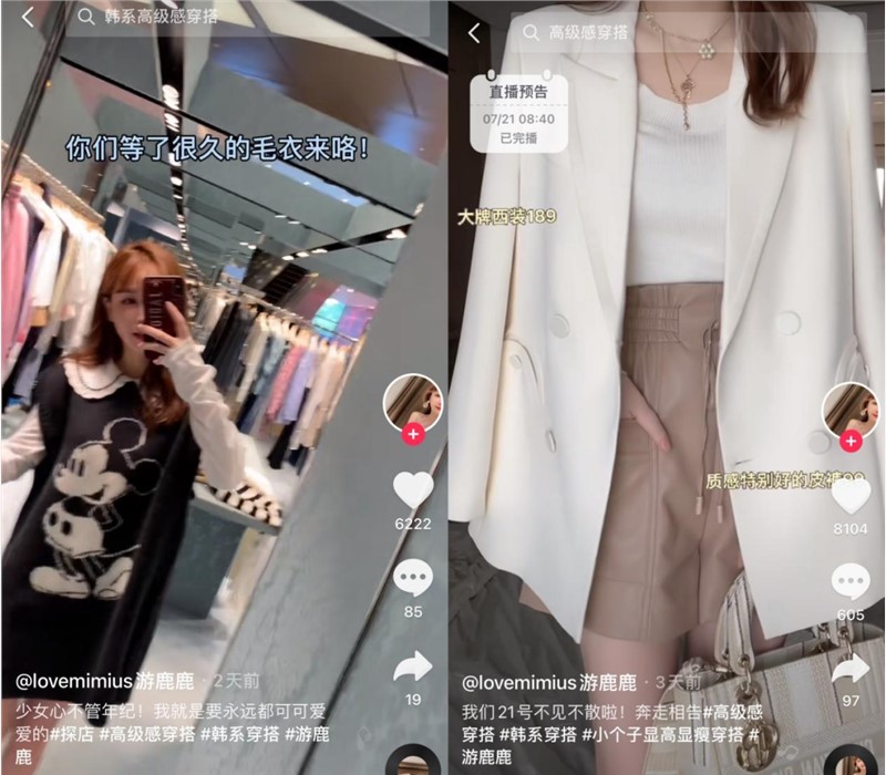 观察游鹿鹿发布的穿搭混剪和探店Vlog等视频内容可知,其通过上身效果和版型设计吸引用户,再以“韩系穿搭”“小个子显高显瘦穿搭”等常用话题来直播优惠预告,引导用户点击进入直播间。